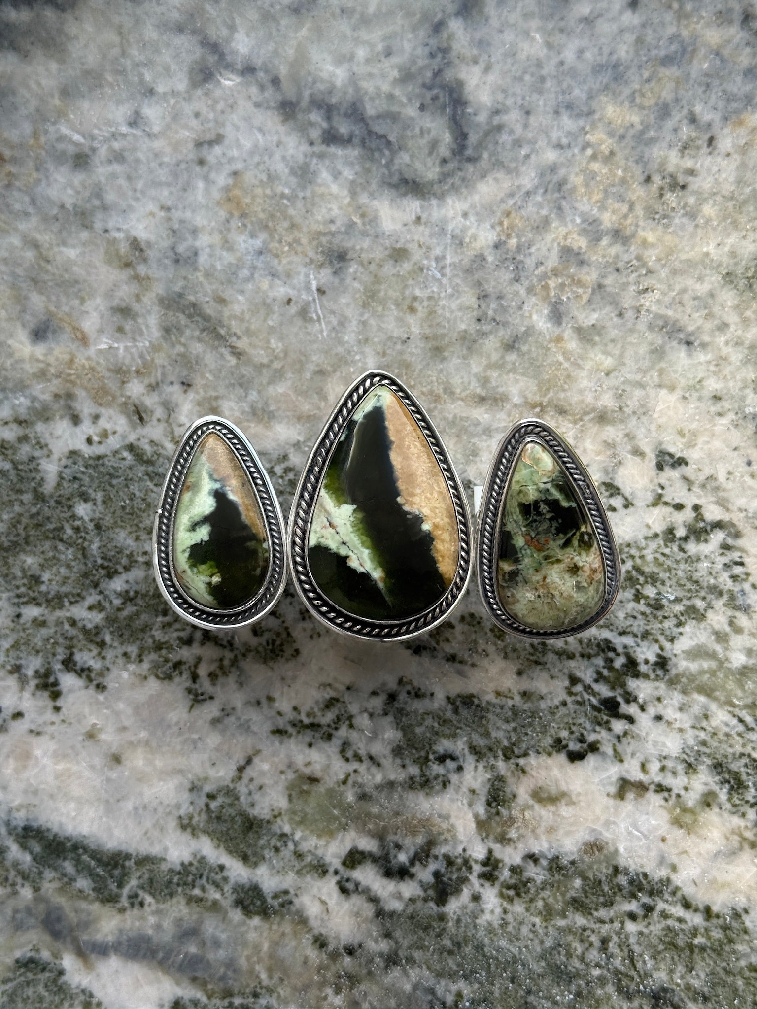 This drop-shaped and oversized gemstone ring is handmade with authentic and natural Chrome Chalcedony and set in 925 Sterling Silver. The rich hue of the chalcedony creates a bold statement piece that complements any outfit. Each ring features unique variations in the stone's pattern, making your jewellery truly one-of-a-kind. The sterling silver setting ensures durability while providing a classic, elegant contrast to the deep tones of the gemstone.