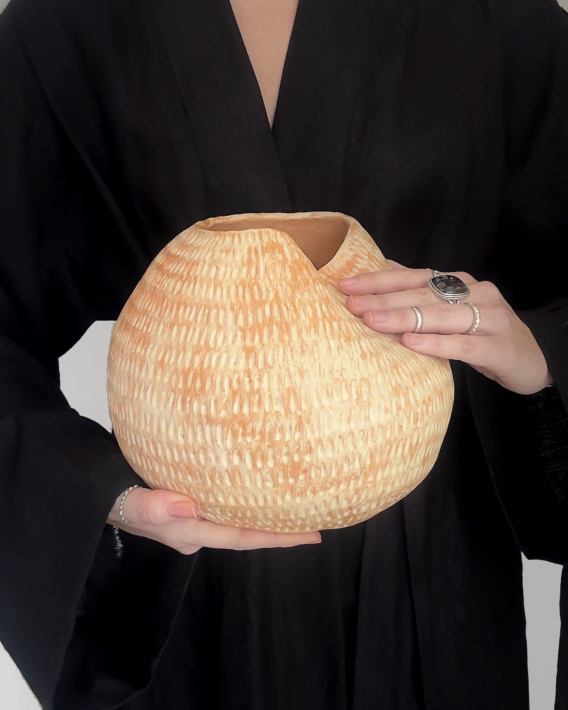 Fold is a handcrafted vessel with a carved surface in a textured pattern that gives depth and warmth to the body. The form curves gently into a soft fold along one side, creating a sense of movement and balance.